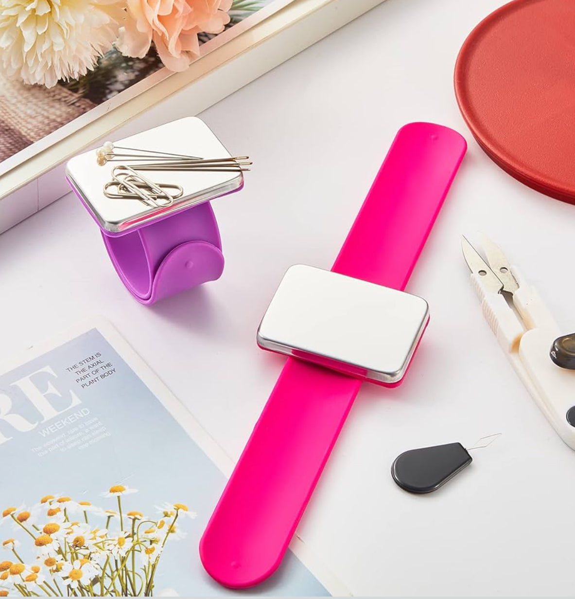 A versatile magnetic wristband designed for sewing, braiding, quilting, and hairstyling. The soft silicone cuff sits comfortably on your wrist while powerful embedded magnets securely hold pins, needles, hair pins, braiding gel, clips, and small tools within easy reach. Ideal for crocheters, braiders, hairstylists, and DIY crafters who want quick access to metal pins and accessories without dropping or losing them. The one-size-fits-all elastic-silicone band is lightweight, portable, and adjustable for a snug fit. A protective film on the magnet can be removed before use for maximum efficiency.